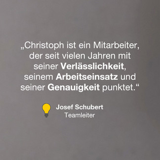 „Christoph ist ein Kollege, der seit vielen Jahren mit seiner Verlässlichkeit, seinem Arbeitseinsatz und seiner Genauigkeit punktet. Durch seine langjährige Berufserfahrung bringt er wertvolle Expertise in Projekte ein. Wir schätzen neben all diesen Eigenschaften auch besonders sein Pflichtbewusstsein.“ – Josef Schubert, Teamleiter