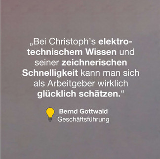 „Bei Christoph’s elektrotechnischem Wissen und seiner zeichnerischen Schnelligkeit kann man sich als Arbeitgeber wirklich glücklich schätzen. Kein Wunder, dass unsere Techniker:innen besonders gerne mit ihm zusammenarbeiten. Wir schätzen zudem seine Loyalität.“ – Bernd Gottwald, Geschäftsführung